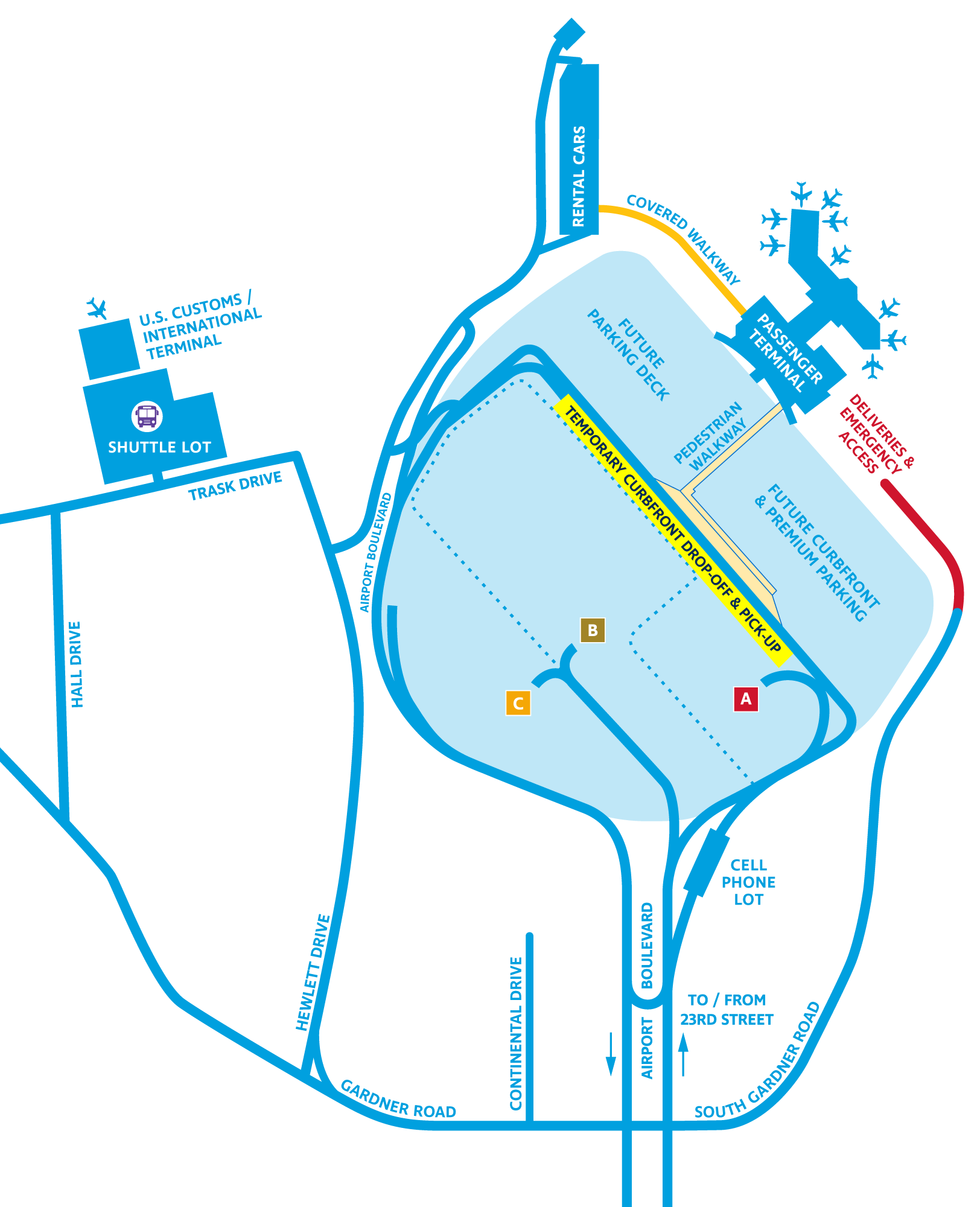 If you are picking up passengers you may wait for them in the new Cell Phone Lot, conveniently located to the right off Airport Blvd. There will be signs directing you to the cell phone lot. Once the passenger has contacted you that they are ready for pickup, simply proceed to the front of the temporary curb front to pick-up your guest.